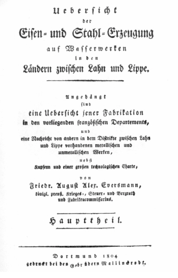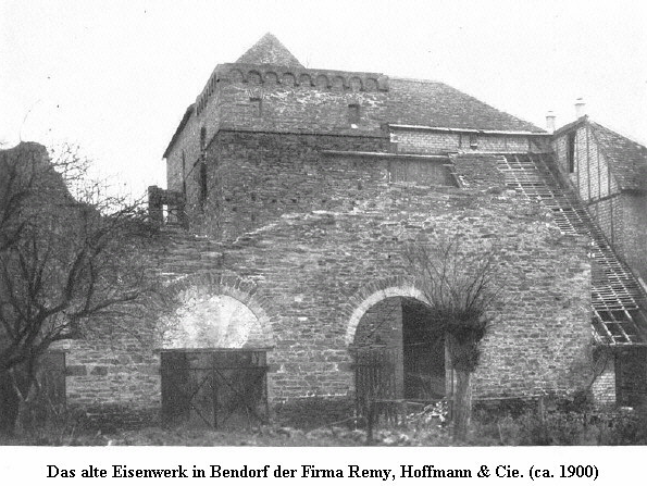 In einem im Jahr 1804 in Dortmund erschienen Werk des kgl. Preuß. Bergrates und Fabrikkommissarius Eversmann „Ueber die Eisen- und Stahlerzeugung in den Ländern zwischen Lahn und Lippe“, bezeichnet der Verfasser als Hauptstellen des Bergbaues und der Eisenhütten, das Siegerland, die Dill- und Lahngegend, den Westerwald und das in der Grafschaft Sayn-Altenkirchen am Rhein liegende Gebiet von Bendorf. In den letztgenannten Gegenden habe man, schreibt er, (Seite 16), einen Ueberfluß an vortrefflichem Stahl-. und Eisenstein, jedoch Bedarf an Steinkohlen und Holz. Man stände deshalb von hier in Verbindung mit den über-rheinischen französischen Departements, indem man Holz von der Mosel und Kohlen von Saarbrücken erhalte, wogegen man Stahleisen, besonders von Bendorf, zur Verbesserung des Hunsrücker Eisens schicke. Ueber die Hütten- und Bergbaubetriebe in Bendorf berichtet Eversmann, nachdem er in dem Abschnitt, „Amt Bendorf“, die Person des Hauptbegründers der Bendorfer Eisenindustrie, Wilhelm Remy, als einen Mann rastlosen Wirkens gewürdigt hatte. wie folgt: „Die Nachkommen dieses Remy, der nachher Commerzienrath wurde, machen jetzt das bedeutende Handlungshaus Remy & Hoffmann zu Bendorf aus. Einer der Principalen derselben, Herr Friedrich Remy, leitet vorzüglich das dortige Berg- und Hüttenwesen, und gibt ein seltenes Beispiel, daß dieses Gewerbe auch ohne Curatel, bestehen, und mit einer musterhaften Ordnung und Wirtschaftlichkeit betrieben werden kann.“